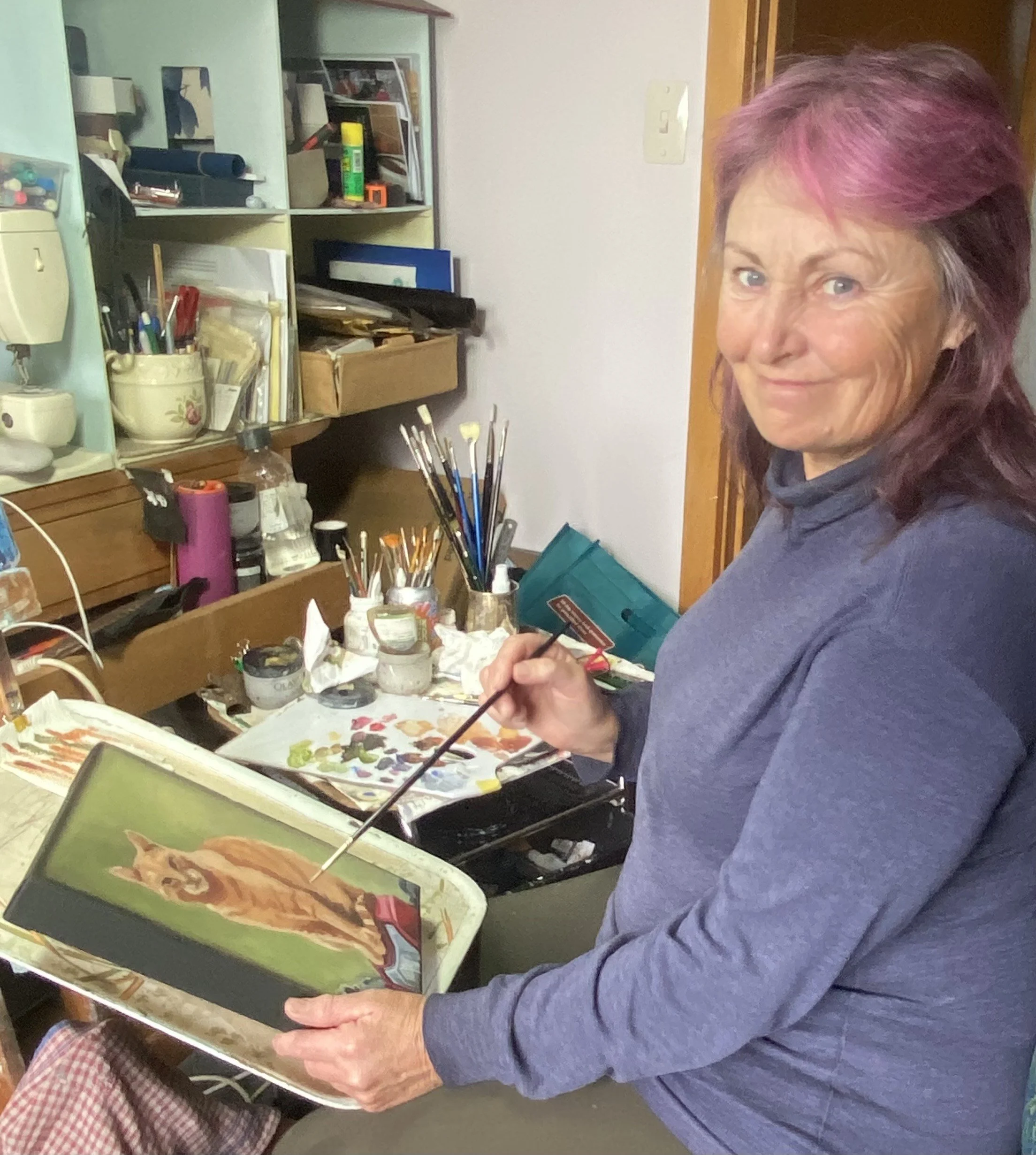 Sharon says: My art medium is acrylic, in particular acrylic fluid art. I pour my backgrounds using a number of different techniques. When dry I embellish with different subjects depending on the colour and flow of the paint. I enjoy painting with Rangiora Arts Society of which I am on the committee